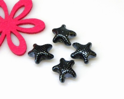 Perle in ceramica lucida a forma di stella marina bombata; Colore nero boreale; Misura circa 20x10 mm; Il foro è da circa 3 mm; Confezione da 1 pezzo € 0,50.